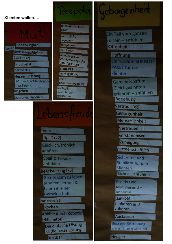 Dazu haben wir in einem Workshop Worte gesammelt, die für die Mitarbeitenden wichtig sind, wenn sie an die Arbeit mit Klienten denken.